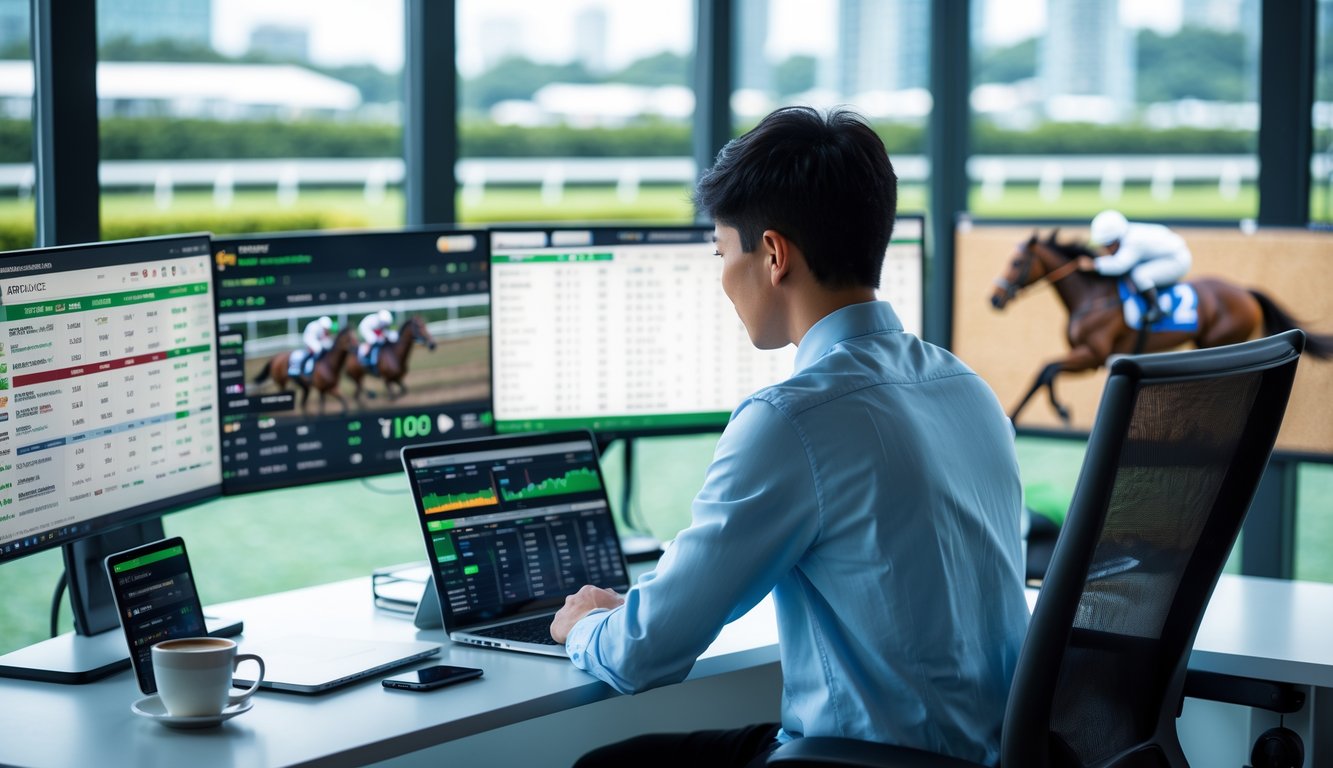 Seseorang muda duduk di meja dengan beberapa layar yang menampilkan statistik dan video balap kuda dari Hong Kong dan Singapura, di latar belakang terlihat lintasan balap kuda.