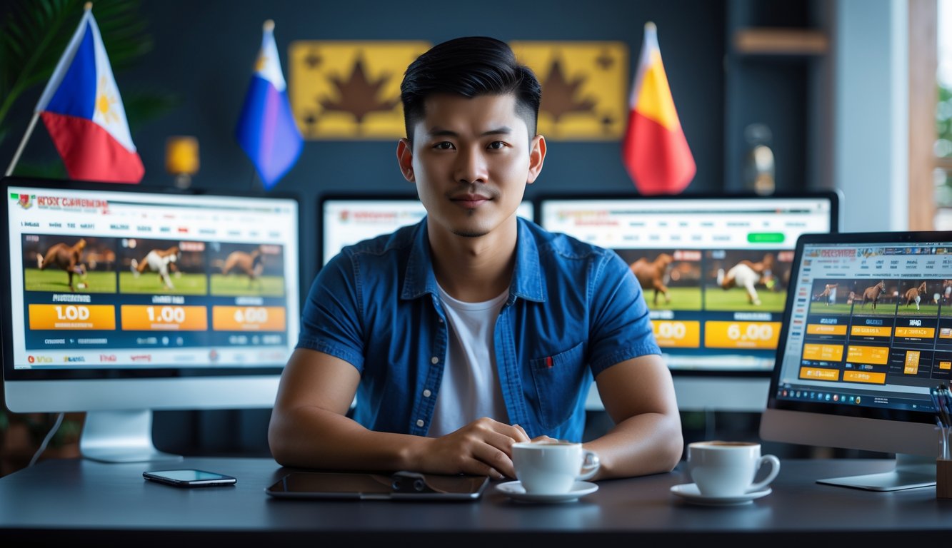 Seorang pria muda duduk di depan komputer dengan layar yang menampilkan pertandingan sabung ayam dan peluang taruhan, di sebuah ruangan dengan dekorasi khas Filipina.