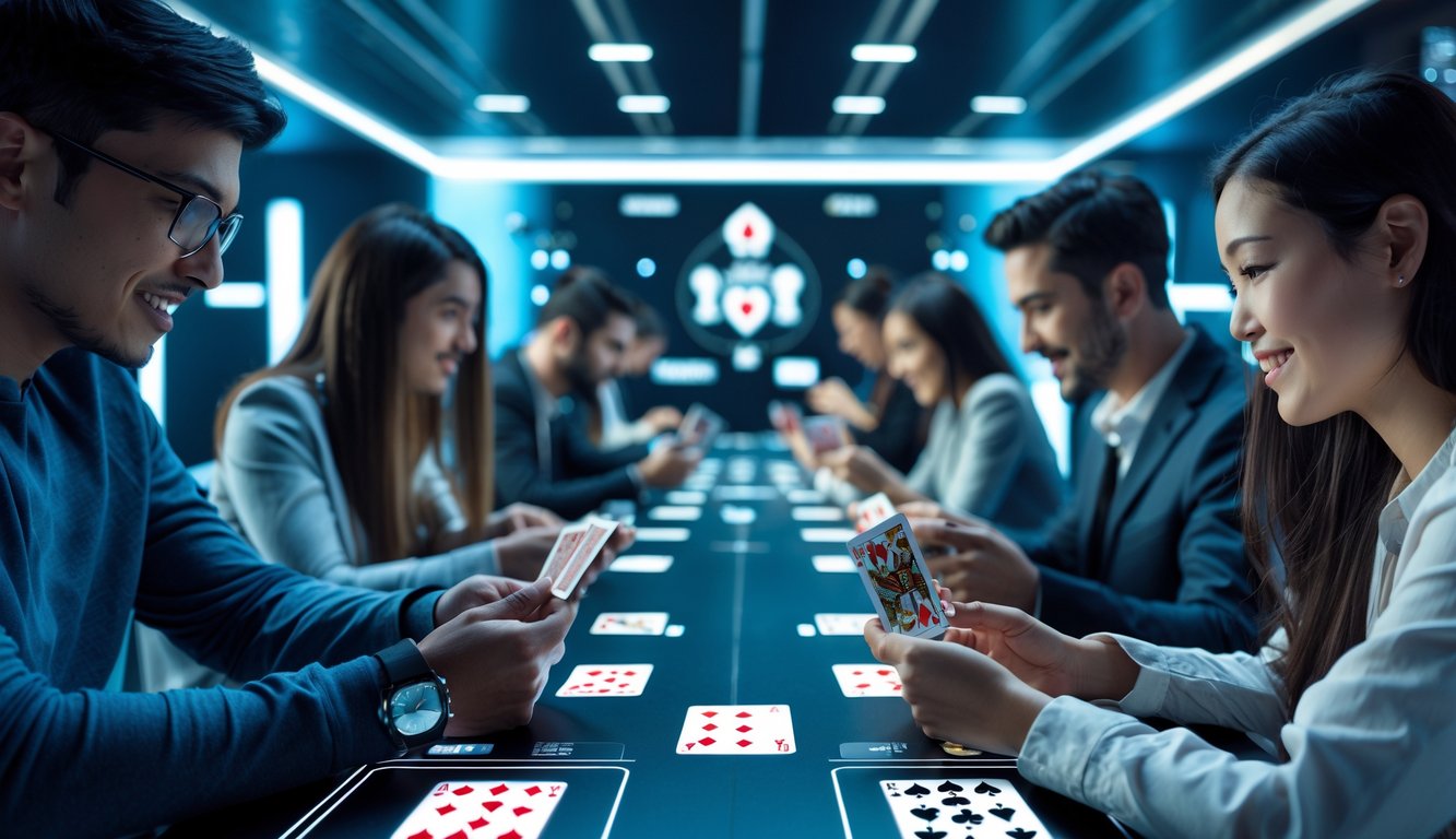 Sekelompok orang bermain kartu secara online menggunakan perangkat digital dalam suasana yang modern dan cerah.
